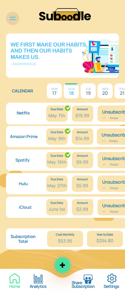 The users can now use a mobile friendly design to keep track of all subscriptions in detail knowing the due date, past billing, future billing and amount. The user can also unsubscribe with a swipe allowing easy cancellations that are documented.