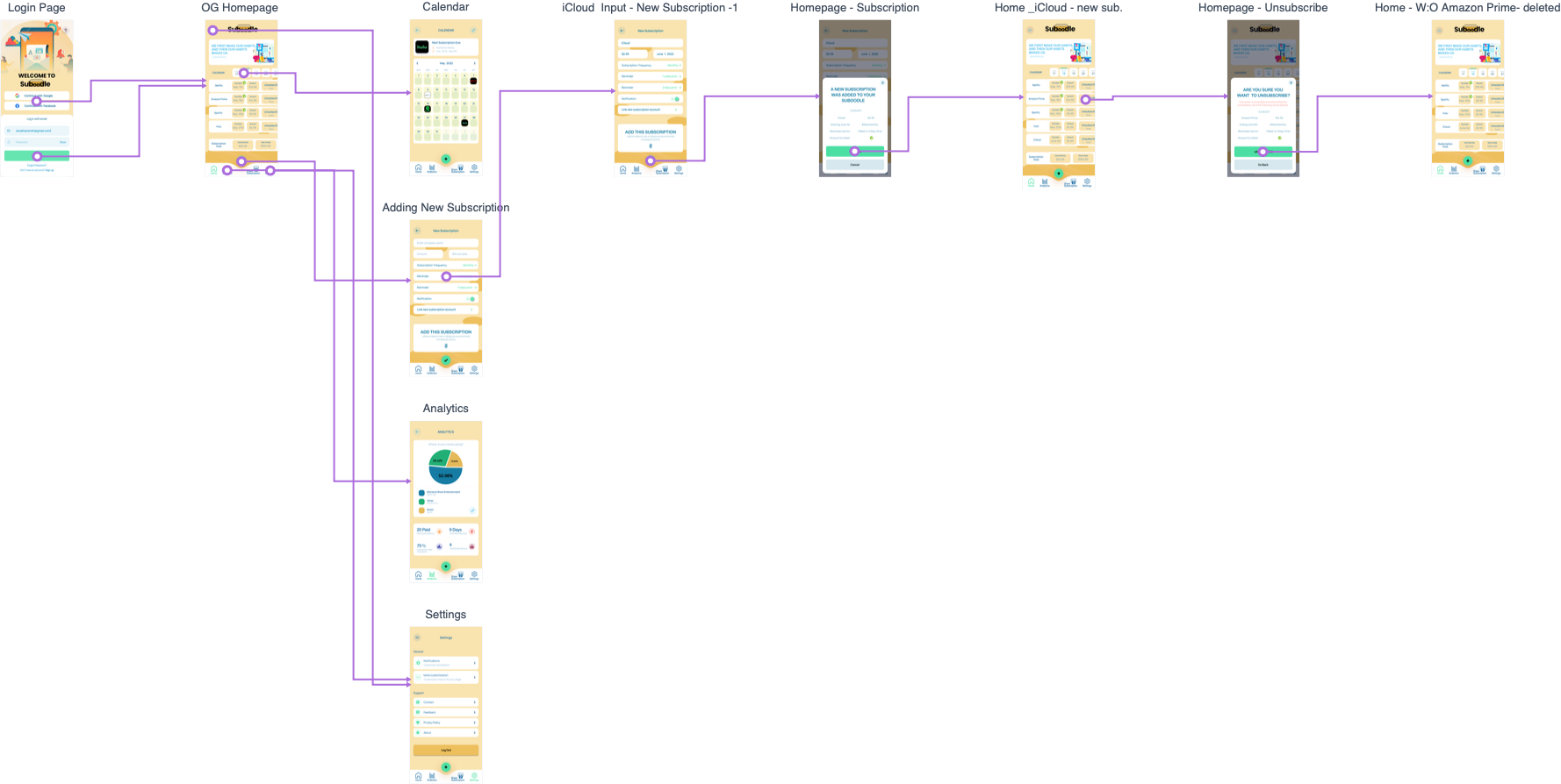 The first version of the Low Fidelity User Flow Map shows the process of the user wanting to add a subscription going back to the home screen then unsubscribing from a different subscription. These two MVP’s are the top priority services that Suboodle provides. The goal in this phase was to make sure that there was a consistent flow between screens and that all screens were evaluated to make sure they served a purpose.